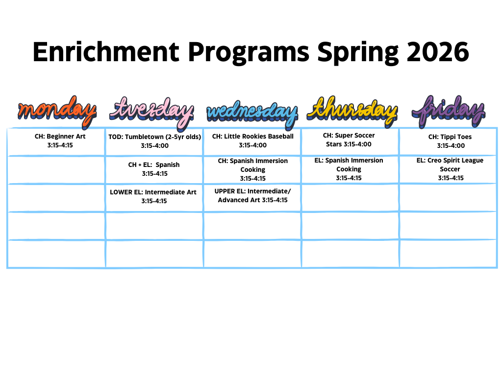 *All questions about After School Enrichment Programs should be directed to Roseanna Madrid: Roseanna@creoschool.org.